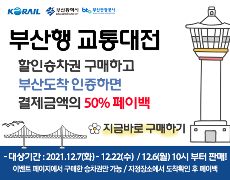 그래서 KTX 반값 프로모션은 어떻게 하는 거냐고요? 네 알려드리겠습니다. 부산관광공사에서 지역경제 활성화와 관광객 유치를 위한 부산행 프로모션에 한국철도공사가 참가하게 되었는데요, 바로 오늘 6일부터 예매가 열리고요, 부산역, 구포역에 도착하는 경부선 KTX 편도 운임을 50% 환급하는 프로모션을 진행합니다!(대상기간 2021.12.7~12.22) 주의사항은 KTX 예매 어플(코레일톡) 또는 레츠코레일 홈페이지에서 프로모션 예매를 하셔야 하는 점이고요, 열차 도착 후 48시간 이내 부산역, 구포역 지정장소(여행센터, 매표창구)에서 승차권 제시하여 페이백 받을 수 있는 점 꼭 숙지하시기 바랍니다. 자세한 사항은 VISIT BUSAN 홈페이지, 레츠코레일 등에서 확인하실 수 있습니다. KTX 부산행 50% 프로모션을 통해 저렴하고 안전한 기차여행이 되시길 바라며 저는 이만 가보겠습니다.