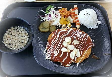 이 집 돈가스는 다릅니다. 청송사과돈가스! 바로 지역특산물인 사과를 이용하여 돈가스의 꽃인 소스를 만들었는데요, 이 맛이 사과향이 은은히 나면서 새콤달콤한 게 아주 괜찮더라고요, 돈가스 튀김의 그 느끼한 맛을 완벽하게 잡아준답니다. 어린이 입맛뿐만 아니라 성인들도 아주 맛있게 먹을 수 있는 맛입니다.